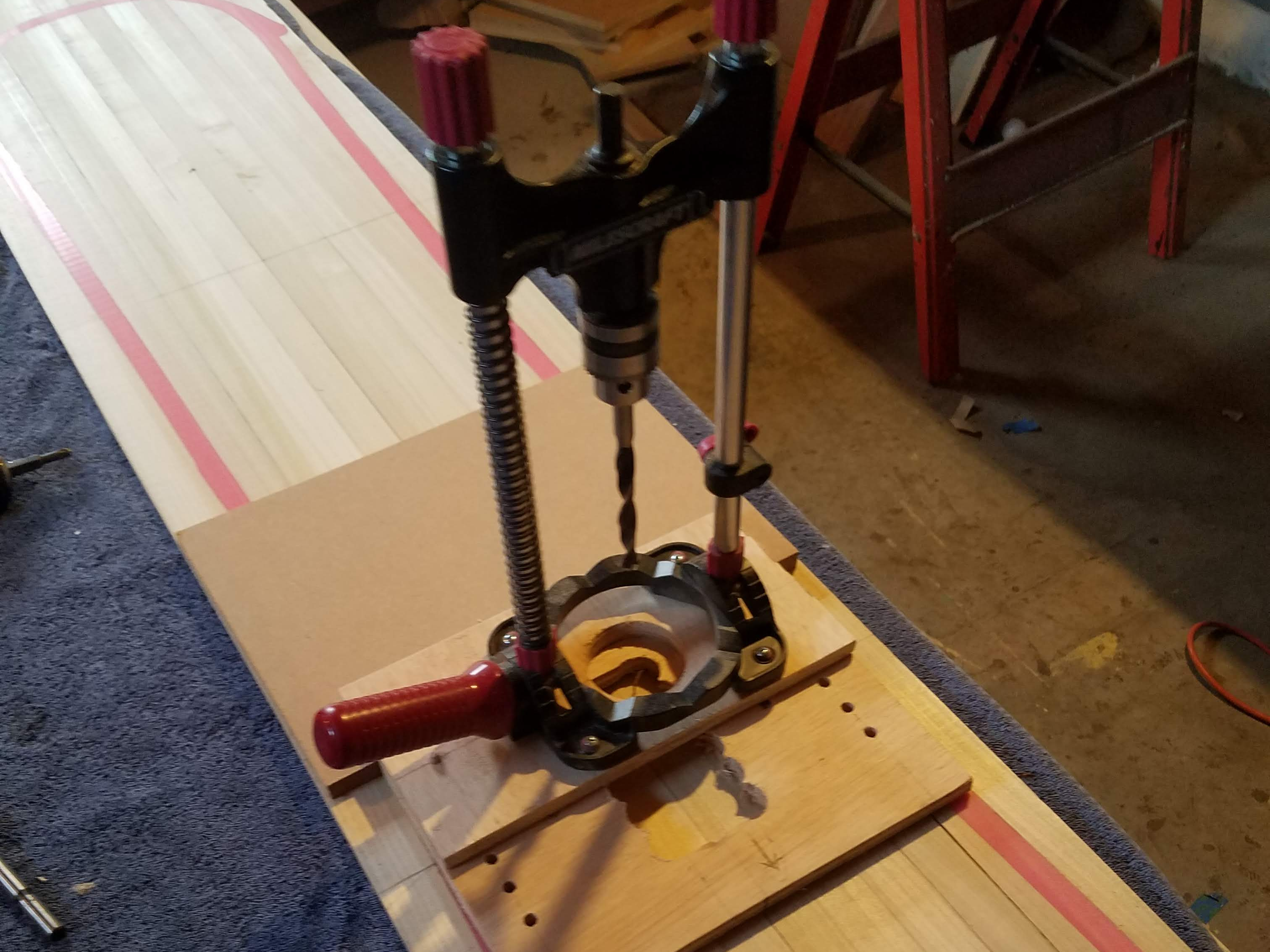 What we are left with is a jig that, when aligned to the center of the snowboard core, will produce that industry standard hole pattern. The drill mate also features a depth stopper. This allows me to swap in a forstner bit and counter-bore the holes so they are ready to receive binding inserts.