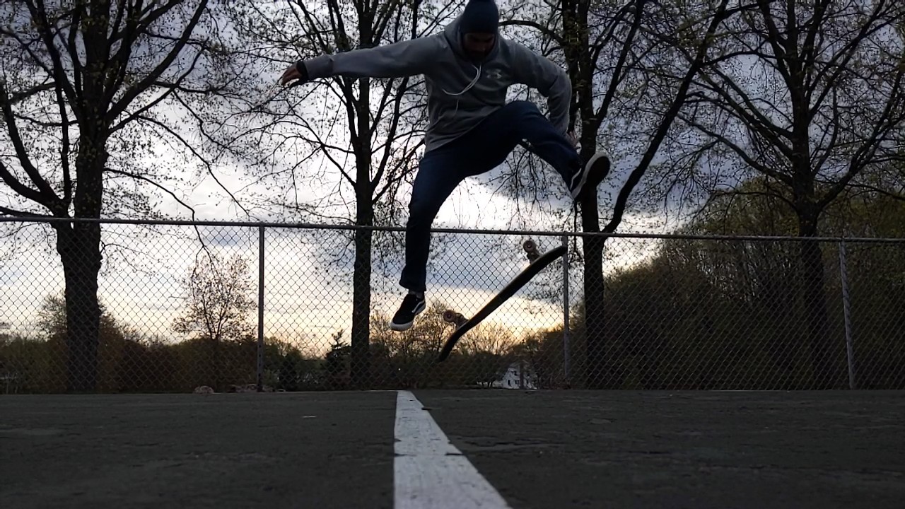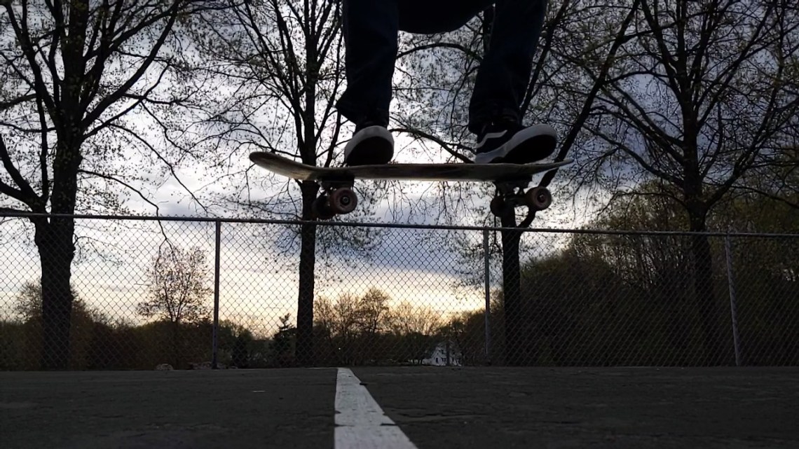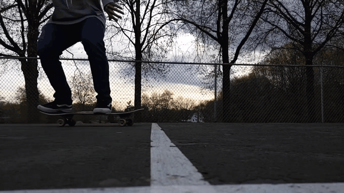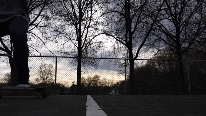 I did not land that heel flip, but I really like how the picture looks! I was up at 7 this morning, it was a little chilly but dry. I went back to that basketball court, I like this place better than the parking lot. Spent a half hour practicing ollies, getting more and more comfortable with them. Still working on height, and in the slow-mo videos you can kinda see how stiff my hips are… I tried going for more height, focusing hard on leveling out by pushing the front more forward than down. This is the closest I got:
