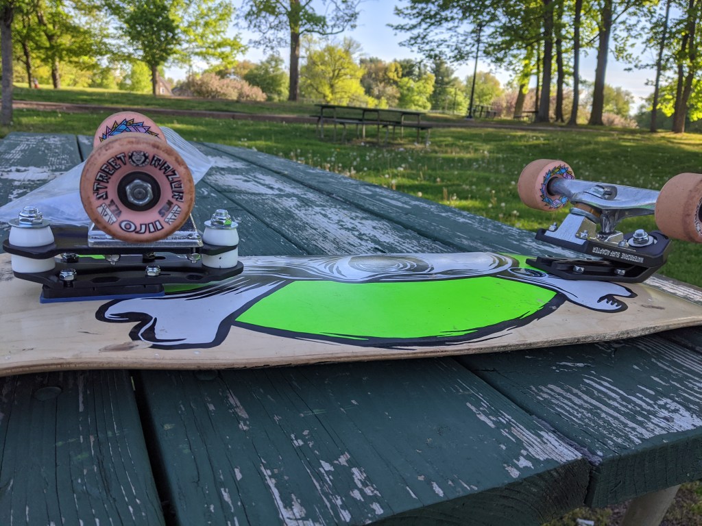 At some point during the morning I thought I should turn the rear adapter around. I noticed that the way I mounted it set the rear truck forward, shortening the wheelbase. I thought a longer wheelbase and an effectively shorter tail might help. Longer wheelbase = stability, shorter tail = less likely to pop a wheelie when pumping off my back foot for speed.